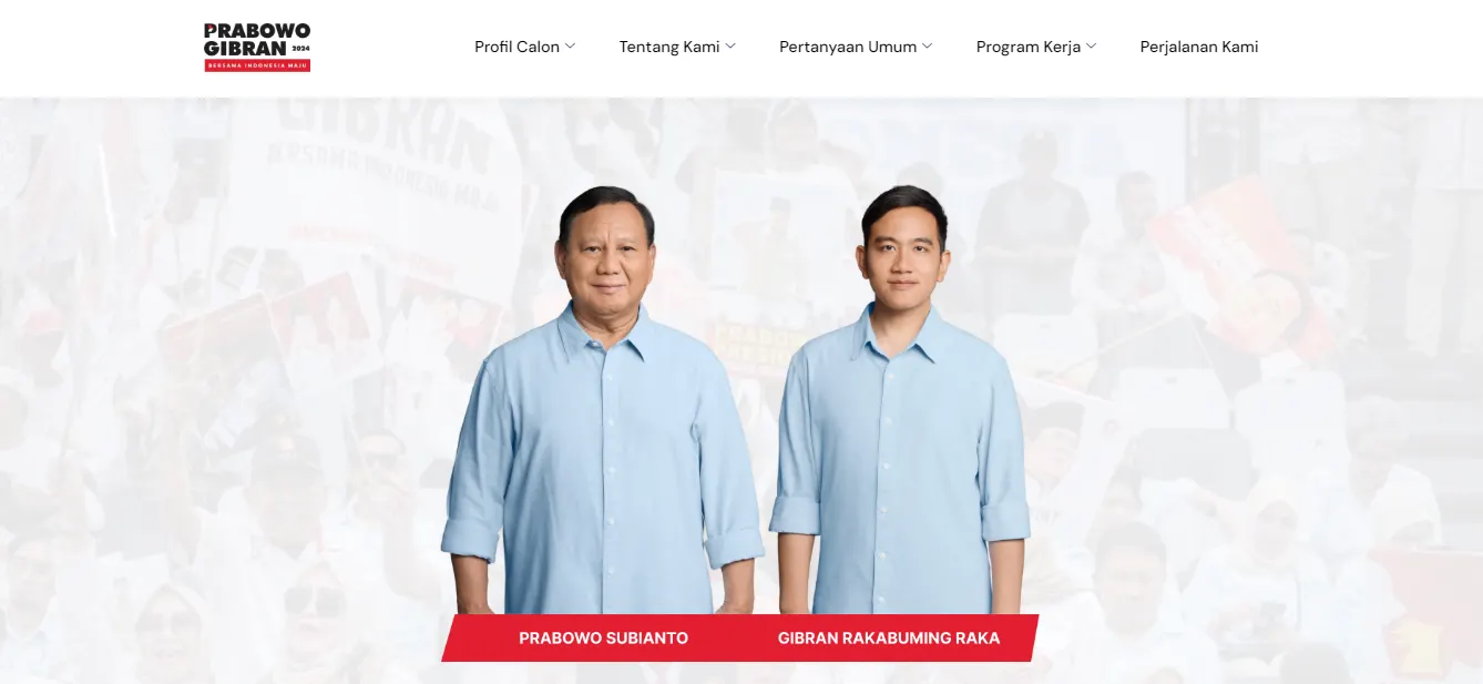 Halaman utama situs prabowogibran2.id menampilkan foto Prabowo dan Gibran yang menggunakan seragam khas mereka berwarna biru muda. Kemudian, latar belakangnya merupakan kolase foto para pendukungnya dengan opacity yang sudah diturunkan.