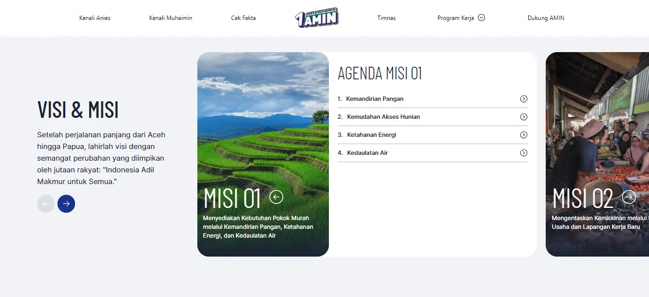Selanjutnya, pengunjung akan diperlihatkan visi dan misi paslon nomor urut 01. Pada bagian ini, akan diperlihatkan visi serta deskripsi singkat terkait delapan misi paslon nomor urut 01. Di bagian misi, apabila diklik, akan muncul poin-poin agenda misi. Masing-masing poin tersebut juga bisa diklik untuk melihat penjelasan yang lebih lengkapnya.