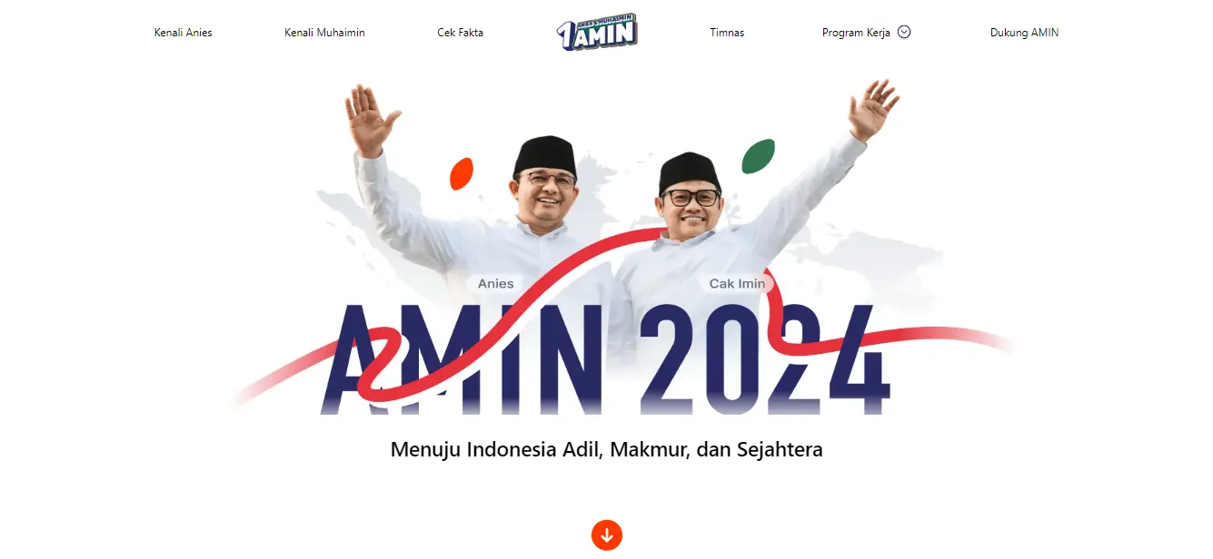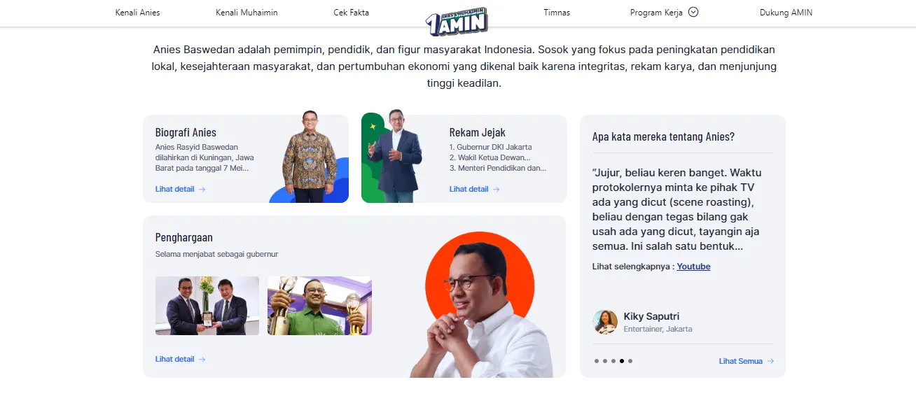 Secara keseluruhan, tampilan situs AMIN menggunakan warna yang cukup nyaman untuk dilihat tanpa banyak hiasan. Selain itu, situs ini memiliki journey pengunjung yang sederhana dan jelas. Pengunjung akan tahu harus klik bagian yang mana apabila ingin mengunjungi profil capres dan cawapres, misalnya.