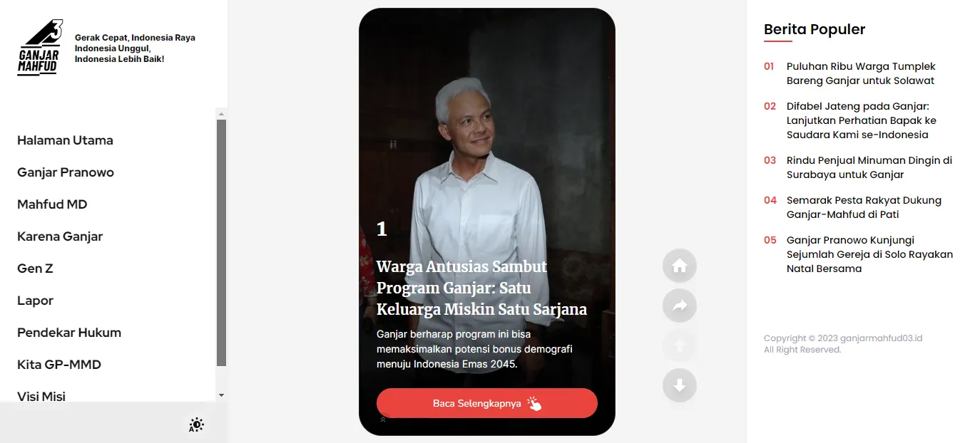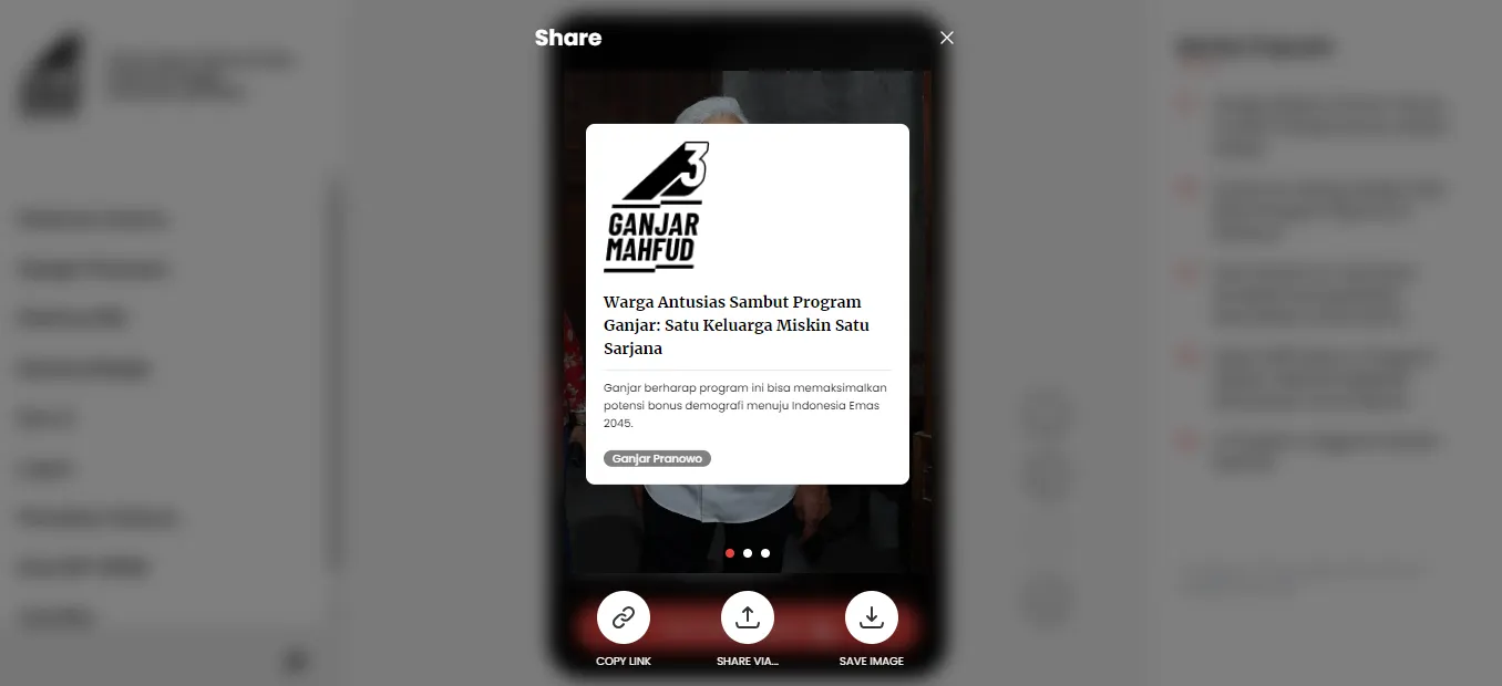 Hal menarik lain dari situs ini adalah saat pengunjung ingin membagikan konten terkait Ganjar-Mahfud, fitur share yang dimiliki situs ini tampilannya mirip seperti fitur share yang ada di aplikasi Spotify. Ada tiga opsi untuk membagikan konten, yakni dengan Copy Link, Share Via (berisi Share as Link atau Share as Story), dan Save Image.