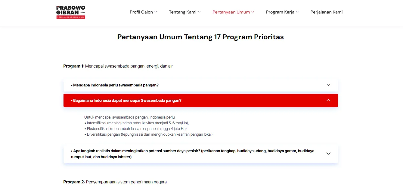 Selanjutnya, pada menu Tentang Kami, berisi Visi dan Misi serta Hubungi Kami yang isinya merupakan kumpulan akun media sosial prabowogibran2. Lalu, menu Pertanyaan Umum berisi opsi 17 Program Prioritas dan 8 Program Hasil Terbaik Cepat. Apabila keduanya diklik, maka akan ditampilkan berbagai pertanyaan mendasar terkait dua hal tersebut.