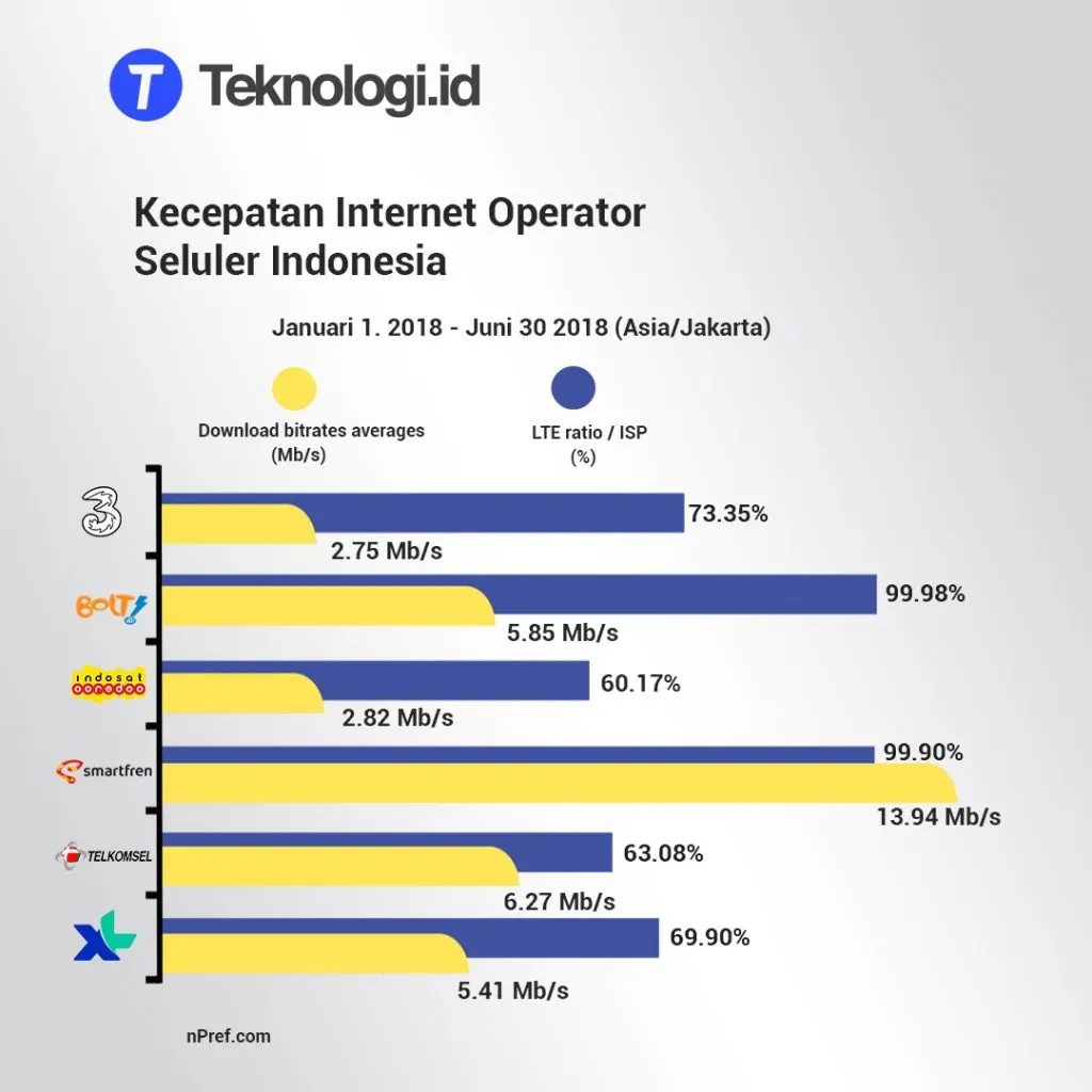 Belakangan ini, perusahaan merilis hasil uji layanan internet kelima operator seluler yang ada di Indonesia dan mengurutkan mereka berdasarkan kecepatan akses. Data nPerf berasal dari ratusan ribu pengujian yang dilakukan pada paruh tertama 2018 di Tanah Air.