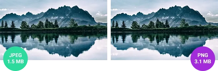 Pada jenis PNG, fitur kompres yang digunakan adalah Losless sehingga foto dapat dioptimalisasi tanpa mengurangi kualitas foto tersebut. Hanya saja, dengan menggunakan kualitas foto yang tidak berkurang membuat ukurannya ikut membengkak. Oleh karena itu, dari sisi ukuran gambar PNG memiliki ukuran yang lebih besar dibandingkan versi JPG.