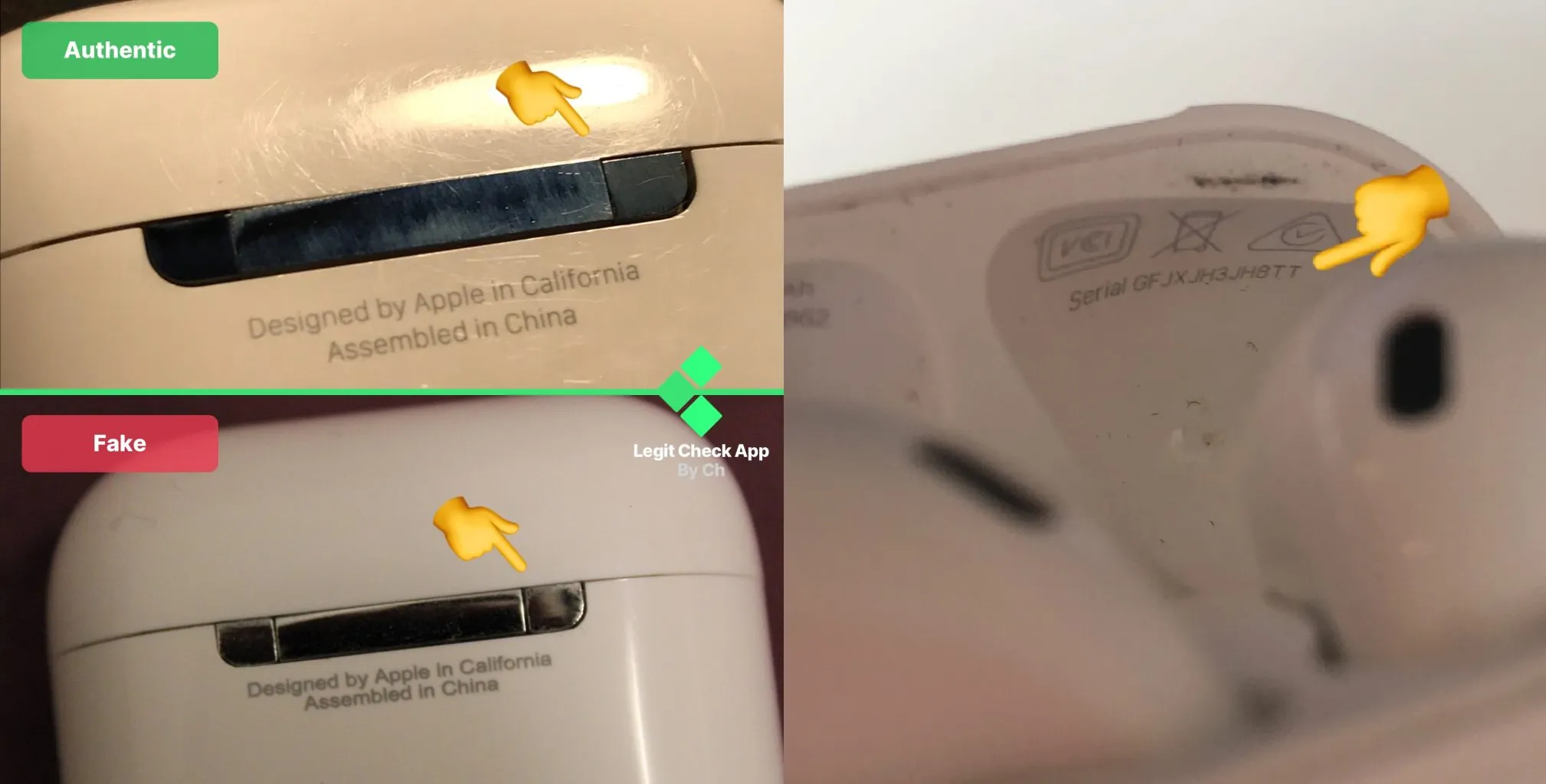 Detail yang sulit untuk ditiru dari produk AirPods ini adalah penutup di bagian bawah pada setiap sisi AirPods, serta Serial Number dibagian dalam battery case, tepatnya dibagian penutup bagian dalam. Produk AirPods yang palsu alias KW tidak memiliki Serial Number.