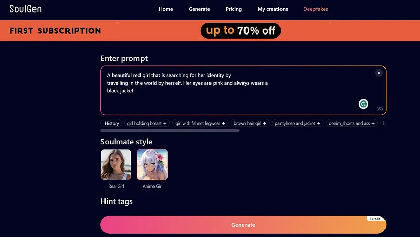 Dengan SoulGen, kamu dapat membuat wanita idaman dalam beberapa detik dengan memasukkan petunjuk teks atau memilih dari tag yang disebutkan untuk menyesuaikan tampilan gadis yang diinginkan. Sebagai produk revolusioner, ini menghasilkan foto yang selalu jauh lebih baik karena algoritme terus berkembang dan meningkat.