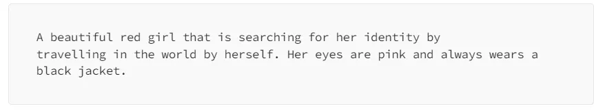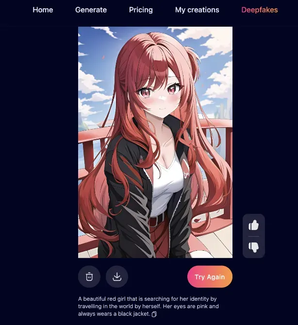 Bisa dillihat bahwa generator ini menghasilkan karakter anime berkualitas tinggi dengan berbagai aspek deskripsi, seperti rambut merah, mata merah muda, dan jaket hitam.