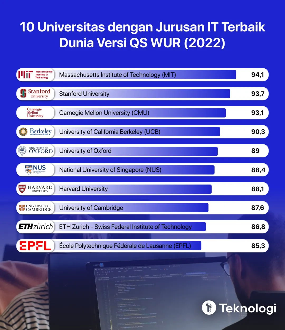 Oleh karena itu, memilih jurusan IT dari universitas terbaik harus menjadi pertimbangan bagi calon mahasiswa. Menurut pertimbangan dari QS World University Rankings (WUR) di tahun 2022 ini, Massachusetts Institute of Technology (MIT) merupakan universitas dengan jurusan teknologi informasi terbaik yang ada di dunia. Jurusan TI dari universitas yang tersohor ini memiliki skor peringkat 94,1 dari 100.