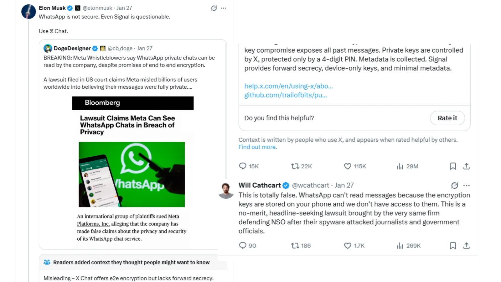 Head of WhatsApp, Will Cathcart, segera mengeluarkan bantahan resmi dan menyebut tuduhan Musk serta gugatan tersebut sepenuhnya salah. Cathcart menegaskan bahwa kunci enkripsi hanya disimpan secara lokal di ponsel pengguna, sehingga Meta tidak memiliki akses teknis untuk membuka pesan tersebut. Ia juga menyerang balik dengan menyebut gugatan ini hanya mencari perhatian media dan diajukan oleh firma hukum yang pernah membela produsen spyware Pegasus.