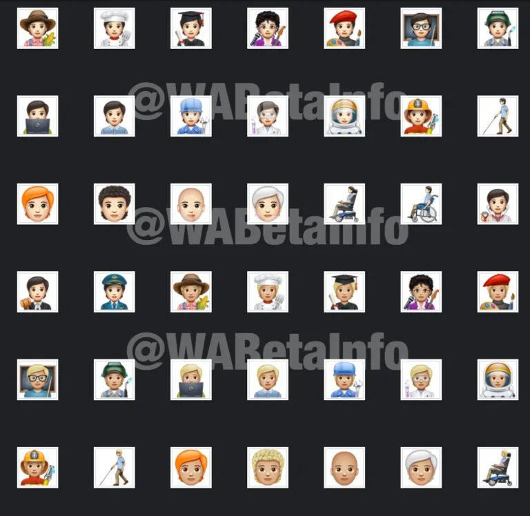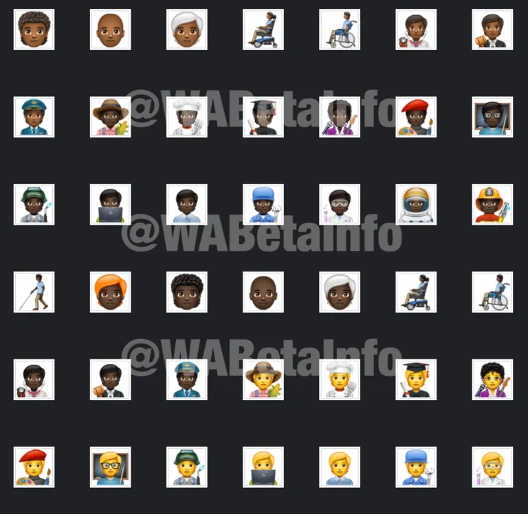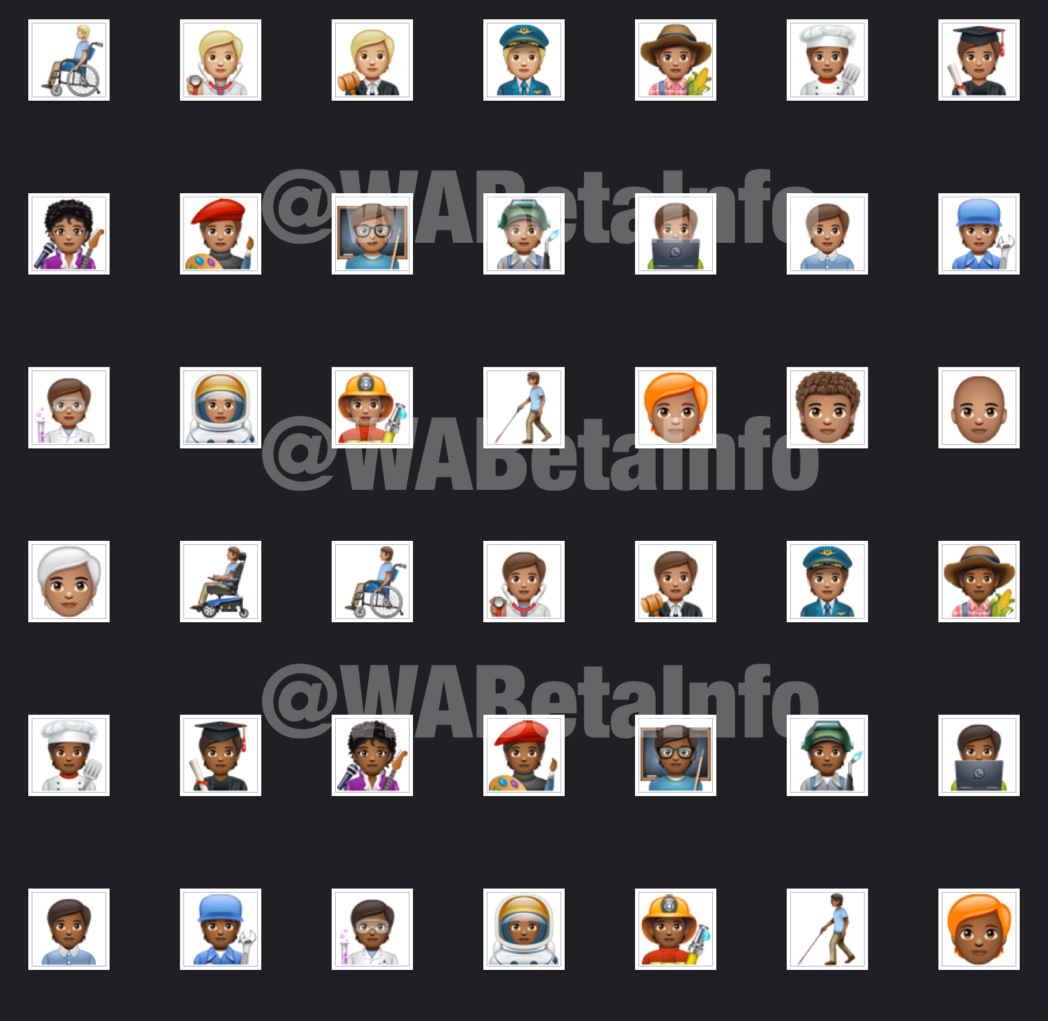 Emoji baru di WhatsApp ini tidak terlihat begitu berbeda dengan yang sudah digunakan pengguna Android saat ini. Tapi, jika dilihat lebih teliti ada beberapa perubahan seperti warna pakaian yang baru, gaya rambut dan warna kulit di beberapa emoji baru. Semua emoji baru ini menggambarkan manusia dalam berbagai profesi dan keadaan fisik. Ada penyanyi, astronaut, petani, pelukis, guru dan masih banyak lagi, serta orang yang duduk di kursi roda dan menggunakan tongkat pemandu jalan.