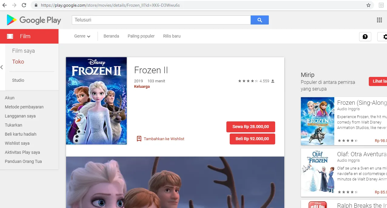Google Play selalu meng-update koleksi filmnya. Nah, untuk harganya sendiri dibanderol dengan harga bervariasi tergantung dari segi kualitasnya, ada yang SD dan HD. Kalian bisa melihat harga untuk membeli ataupun menyewa dengan mengklik film yang dituju. Seperti Frozen II untuk harga sewanya yaitu Rp 28.000 dan untuk harga belinya Rp 92.000. Sedangkan untuk Avengers: Endgame, kalian hanya bisa membeli dan tidak bisa menyewa yaitu dengan harga Rp 98.000.