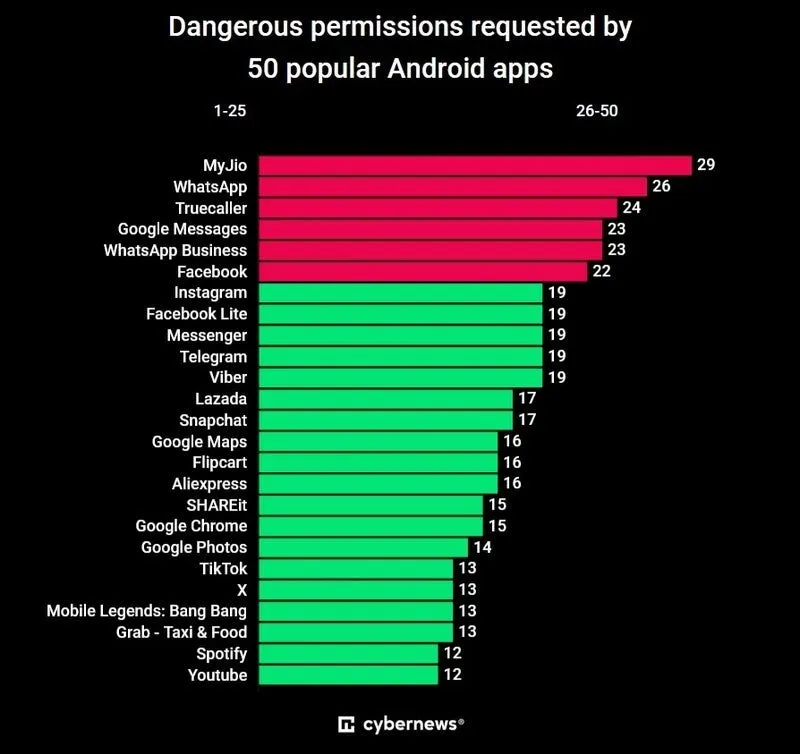 Peringkat berlanjut pada aplikasi Truecaller yang memberikan izin 24 akses berbahaya, Google Message dengan 23 akses berbahaya, WhatsApp Business dengan 23 akses berbahaya, dan Facebook dengan 22 akses berbahaya, dikutip dari Detikinet pada Selasa (17/9/2024).