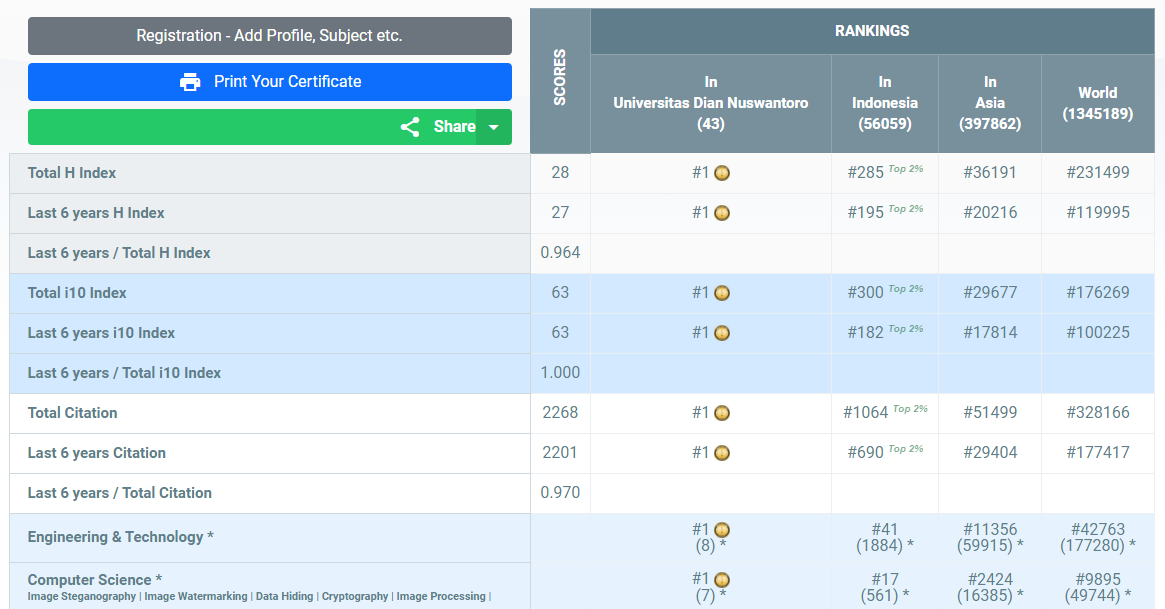 Dengan hasil skor yang tertera di bawah, De Rosal Ignatius Moses Setiadi menempati peringkat #1 Universitas, #285 Indonesia, #36191 Asian, dan #231499 Dunia secara keseluruhan subjek yang termasuk ke dalam kategori AD Scientific Index 2023.