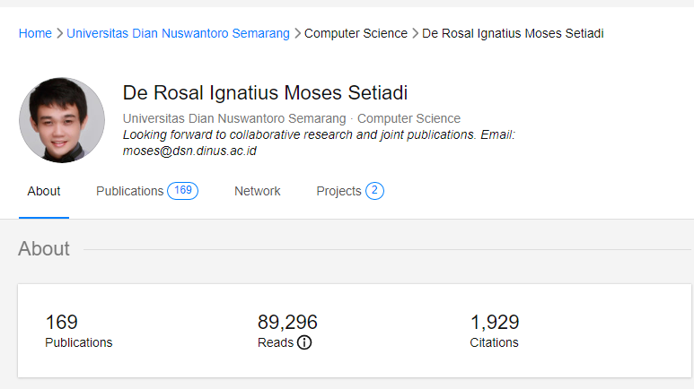 Teknologi.id - De Rosal Ignatius Moses Setiadi menjadi dosen tetap di Universitas Dian Nuswantoro (Udinus) Semarang yang menempati peringkat 42 'Indonesia Top 10.000 Scientist' kategori Subjek Engineering & Technology. Pemeringkatan ini dilakukan oleh AD Scientific Index yang merupakan sistem pemeringkatan dan analisis tahunan berdasarkan kinerja ilmiah dan produktivitas dari sebuah universitas dan/atau seorang ilmuan.