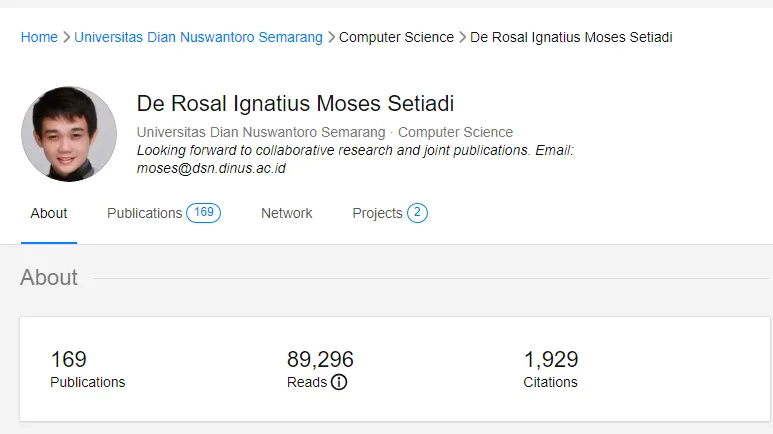 Teknologi.id - De Rosal Ignatius Moses Setiadi menjadi dosen tetap di Universitas Dian Nuswantoro (Udinus) Semarang yang menempati peringkat 42 'Indonesia Top 10.000 Scientist' kategori Subjek Engineering & Technology. Pemeringkatan ini dilakukan oleh AD Scientific Index yang merupakan sistem pemeringkatan dan analisis tahunan berdasarkan kinerja ilmiah dan produktivitas dari sebuah universitas dan/atau seorang ilmuan.