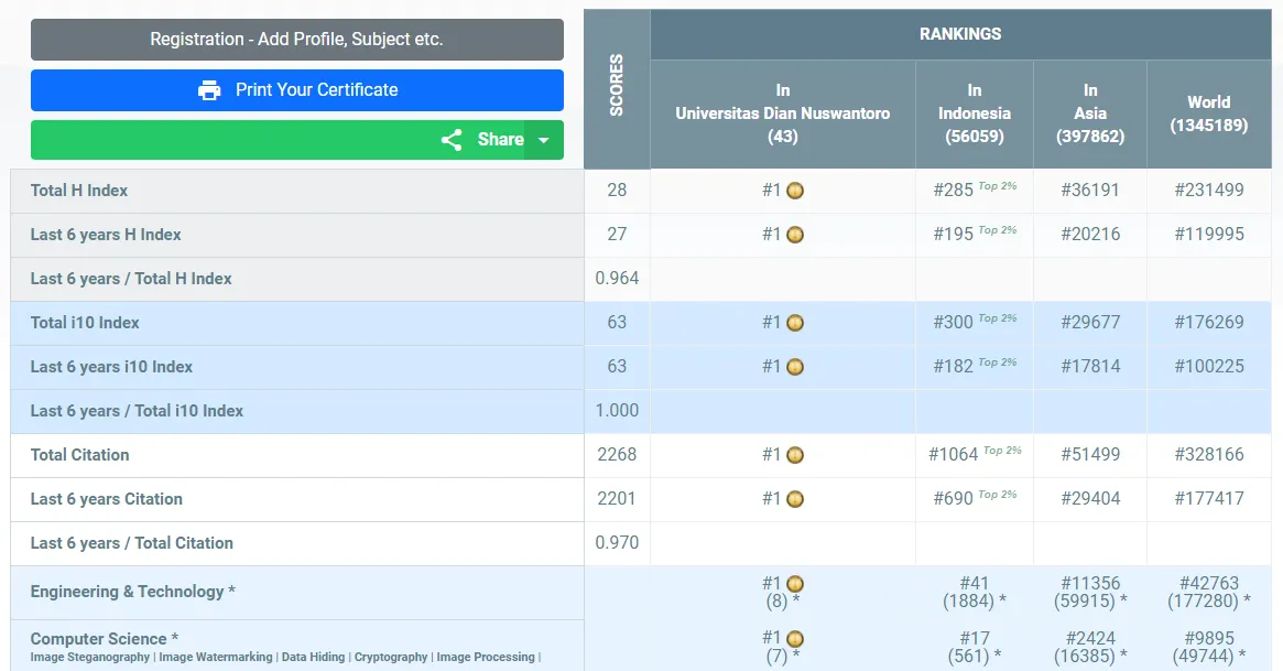 Dengan hasil skor yang tertera di bawah, De Rosal Ignatius Moses Setiadi menempati peringkat #1 Universitas, #285 Indonesia, #36191 Asian, dan #231499 Dunia secara keseluruhan subjek yang termasuk ke dalam kategori AD Scientific Index 2023.