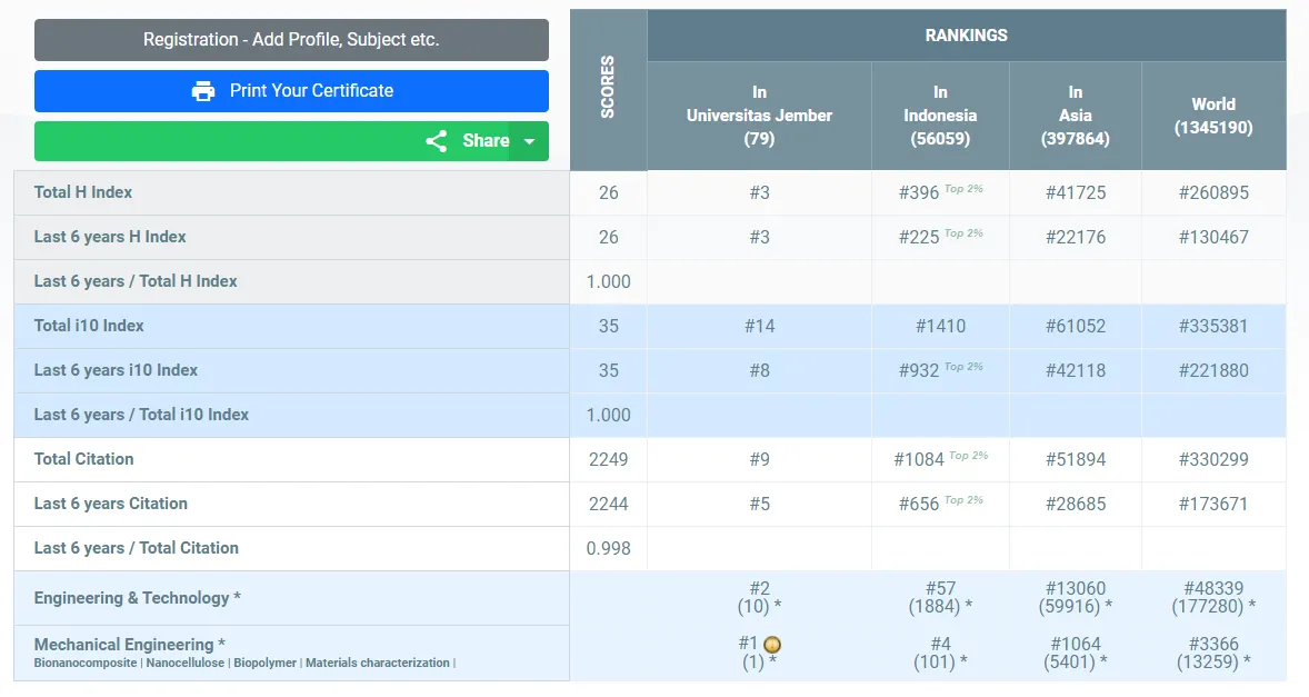 Dengan hasil skor yang tertera di bawah, Mochamad Asrofi menempati peringkat #3 Universitas, #396 Indonesia, #41725 Asian, dan #260895 Dunia secara keseluruhan subjek yang termasuk ke dalam kategori AD Scientific Index 2023.
