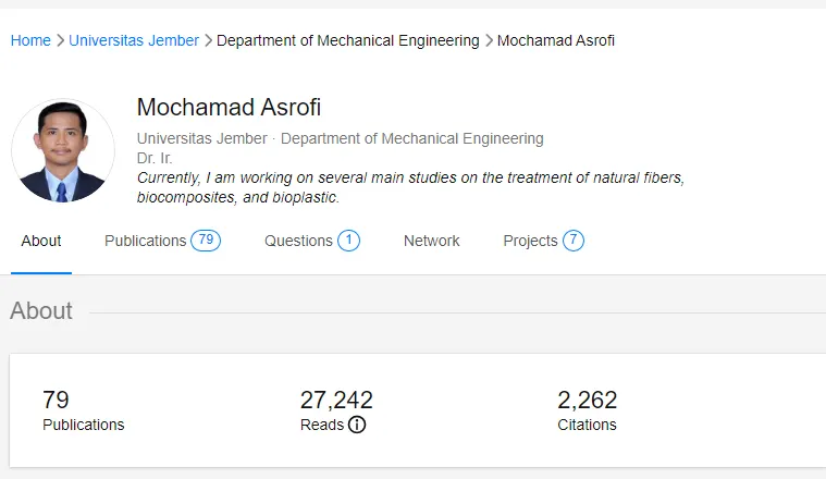 Dr. Mochamad Asrofi, S.T. merupakan dosen di Universitas Jember (UNEJ). Dr. Mochamad Asrofi, S.T. mendapat gelar S1 Teknik Mesin (Konsentrasi Material untuk Energi) Fakultas Teknik di Universitas Jember dengan tahun studi 2011-2015 dan mendapat gelar Doktoral Teknologi Industri Pertanian (Konsentrasi Biokomposit Material) Program Pascasarjana Ilmu-Ilmu Pertanian di Universitas Andalas Padang dengan tahun studi 2015-2019.