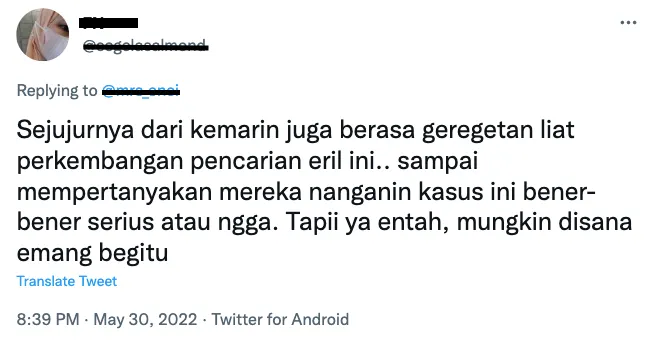 "Sejujurnya dari kemarin juga berasa geregetan liat perkembangan pencarian eril ini.. sampai mempertanyakan mereka nanganin kasus ini bener-bener serius atau ngga. Tapi ya entah, mungkin disana emang begitu," timpal pengguna Twitter lainnya.