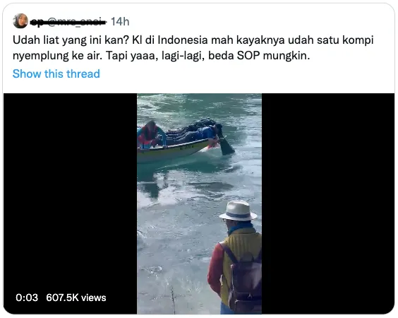 "Kl di Indonesia mah kayaknya udah satu kompi nyemplung ke air. Tapi yaaa, lagi-lagi, beda SOP mungkin," cuit salah satu pengguna Twitter disertai unggahan video proses pencarian Eril.