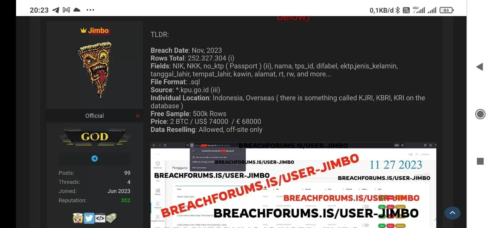 Jimbo mematok harga untuk 204 juta data warga Indonesia yang bocor tersebut sekitar USD 74000 atau sekitar Rp 1,1 miliar.