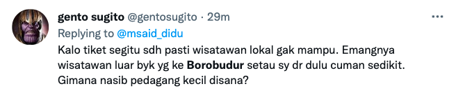 "Kalo tiket segitu sdh pasti wisatawan lokal gak mampu. Emangnya wisatawan luar byk yg ke Borobudur setau sy dr dulu cuman sedikit. Gimana nasib pedagang kecil disana?," ujar akun @gentosugito.