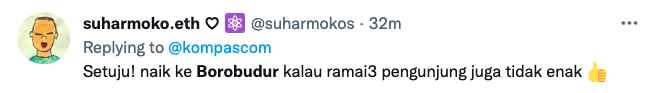 "Setuju! naik ke Borobudur kalau ramai3 pengunjung juga tidak enak," tulis akun @suharmokos.