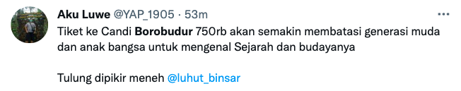 "Tiket ke Candi Borobudur 750rb akan semakin membatasi generasi muda dan anak bangsa untuk mengenal Sejarah dan budayanya. Tulung dipikir meneh @luhut_binsar," ungkap akun YAP_1905.