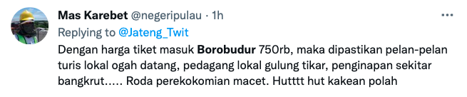 "Dengan harga tiket masuk Borobudur 750rb, maka dipastikan pelan-pelan turis lokal ogah datang, pedagang lokal gulung tikar, penginapan sekitar bangkrut..... Roda perekokomian macet. Hutttt hut kakean polah," tulis akun @gentosugito.