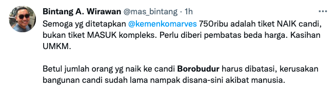 "Semoga yg ditetapkan @kemenkomarves 750ribu adalah tiket NAIK candi, bukan tiket MASUK kompleks. Perlu diberi pembatas beda harga. Kasihan UMKM. Betul jumlah orang yg naik ke candi Borobudur harus dibatasi, kerusakan bangunan candi sudah lama nampak disana-sini akibat manusia," dukung akun @mas_bintang.