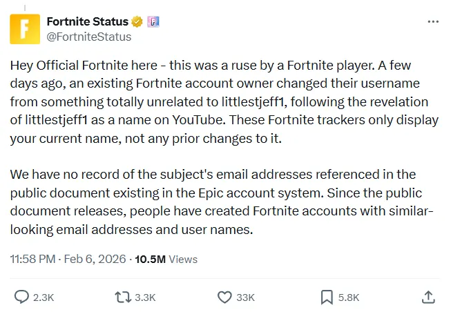 Epic menjelaskan bahwa akun Fortnite yang dimaksud sebenarnya milik pengguna lain yang baru-baru ini mengganti username mereka menjadi “littlestjeff1” setelah nama tersebut muncul dalam dokumen Epstein. Situs pelacak Fortnite hanya menampilkan nama pengguna terkini, tanpa riwayat perubahan nama sebelumnya.