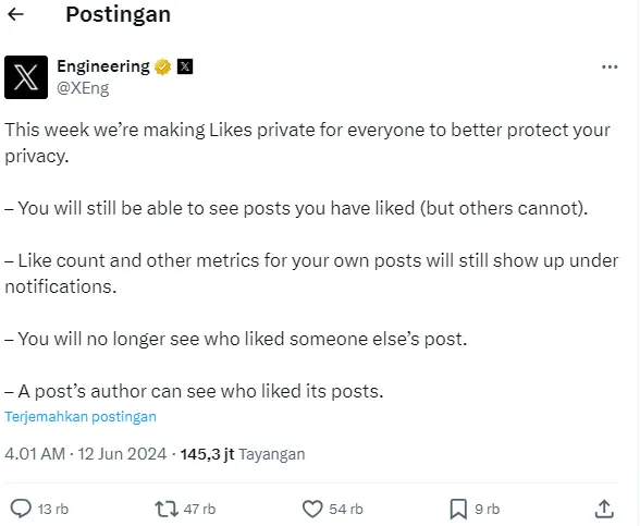 "Anda tidak akan lagi melihat siapa yang menyukai postingan orang lain," tulis @XEng, sebagaimana dikutip teknologi.id, Kamis (13/6/2024).